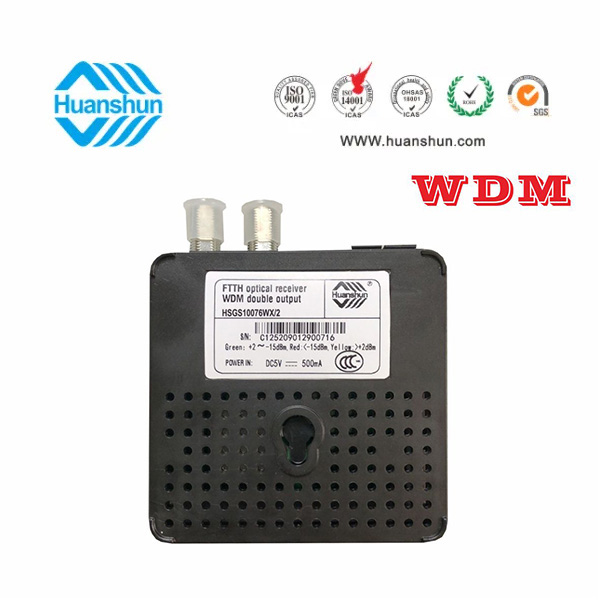 WDM型雙輸出光接收機 | HSGS10076WX/2 | CATV 1540~1565nm接收,-5~-15dBm/RF 2×72dBuv恒定輸出 PON:1270/1310/1490/1577nm;外置90~255V 5V 0.5A電源適配器 |