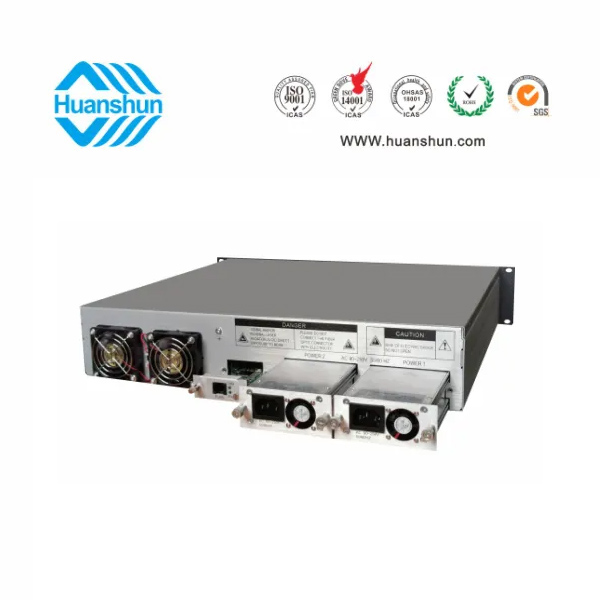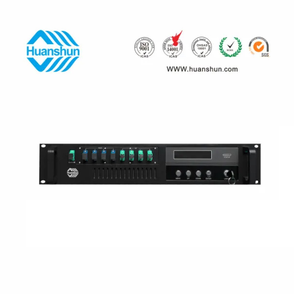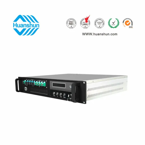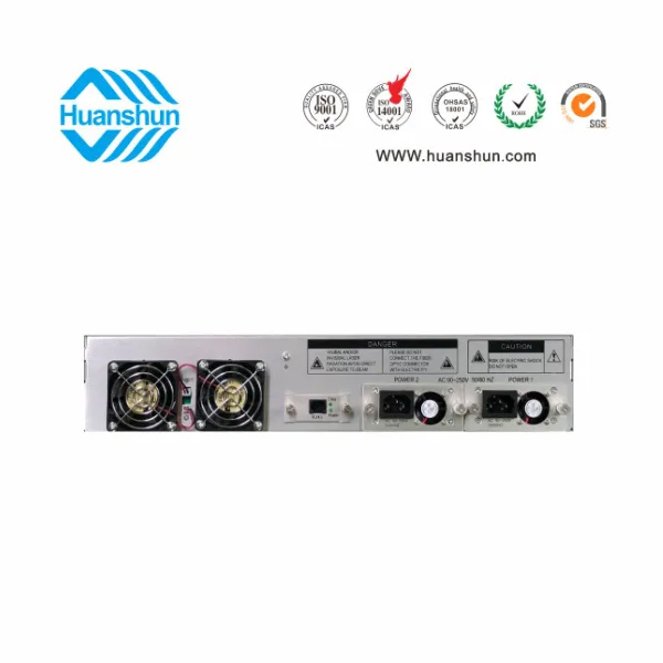 19 " 2U標準機箱,-5 ~ +10 d Bm輸入,4路標稱規格(16、17、18、19、20、21、22、23dBm)放大輸出,并支持下調-2dB,安全連接模式,NF ≤ 5dB(0dBm時);內置FWDM合波器,插播損耗 ≤ 1dB;雙模塊熱插撥電源,AC90 ~ 255V或DC-48V供電,RJ45標準網管(支持SNMP、WEB)