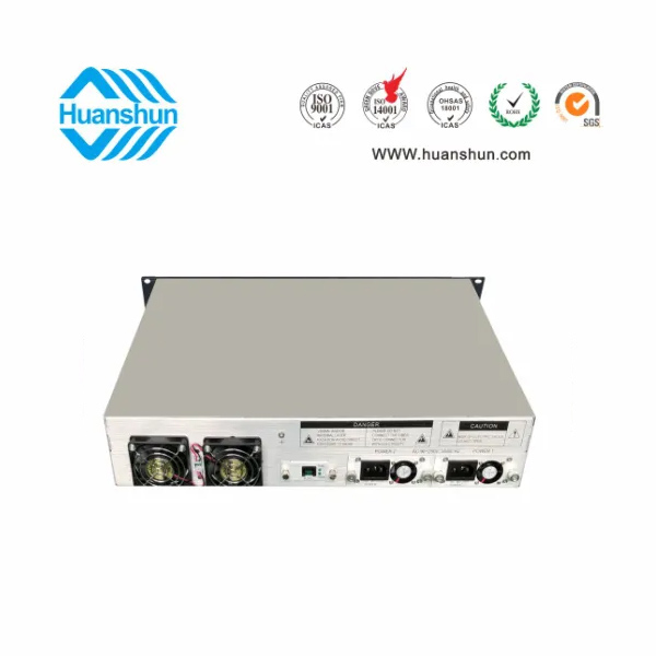 19 " 2U/3U標準機箱,-5 ~ +10 d Bm輸入,8路標稱規格(16、17、18、19、20、21、22、23dBm)放大輸出,并支持下調-2dB,安全連接模式,NF ≤ 5dB(0dBm時);內置FWDM合波器,插播損耗 ≤ 1dB;雙模塊熱插撥電源,AC90 ~ 255V或DC-48V供電,RJ45標準網管(支持SNMP、WEB)