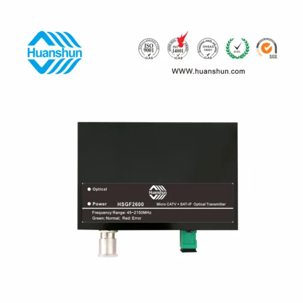HSGF2600有線電視和衛星中頻小功率光發送機,它工作于CATV 45-862MHz和SAT-IF 950-2150MHz帶寬,也可單獨工作于CATV或SAT-IF頻段,經全砷化鎵低噪聲放大加載到1310nm或1550nm同軸型光發管上,并輸出對應波長及相關規格光功率的光信號。為配合衛星高頻頭極化和22K選擇方式,本機增設選擇開關并配合電源指示燈對應電源和22K在線狀態,即13V POWER綠燈,13V+22K POWER綠燈閃爍,18V POWER紅燈,18V+22K POWER紅燈閃爍;Optical燈代表光發功率大小,>1.5mW綠燈,>1mW~<1.5mW黃燈,<1mW紅燈。使用本機可通過光纖實現高質量、長距離傳輸,適用于研究所、學校、運營商衛星異點接收及小區個人用戶使用。