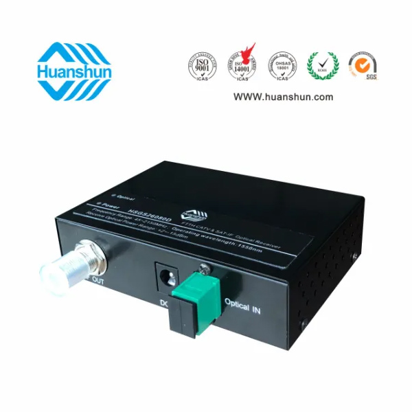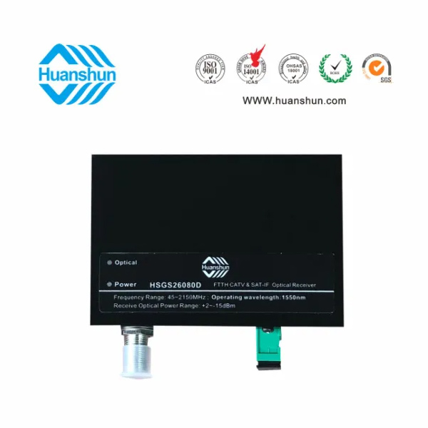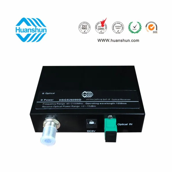 HSGS26082系列CATV&SAT-IF光接收機是一款FTTH型CATV+SAT IF高性能光傳輸設(shè)備,適用于有線電視和衛(wèi)星直播電視同網(wǎng)傳輸。本機選用高帶寬、高靈敏度光電管和低噪聲匹配電路,全鉮化鎵IC放大,光接收范圍-15~+2dBm,光控AGC-8~0dBm/RF80dBuv恒定輸出。為方便用戶使用,本機還在面板上設(shè)有工作電源和光功率接收監(jiān)測LED指示燈。HSGS2608D為濾波型CATV&SAT-IF光接收機,它工作于1540~1565nm波長,在1 纖3波(1550/1490/1310nm)中可獨立接收1550段CATV&SAT-IF光信號。
